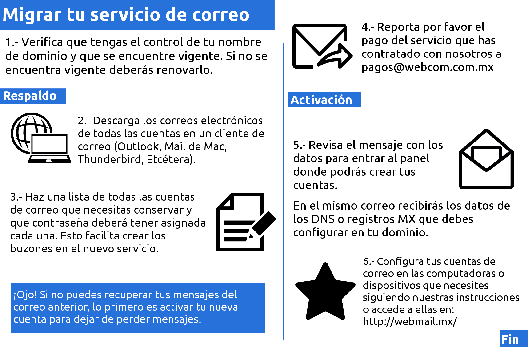 ¿Como migrar mi servicio de correos de otro proveedor a SpaceMail? Alex Lopez 20 de enero de 2024 01:01 Actualización Seguir Hemos preparado la siguiente infografía que te ayudará en el proceso de migración de tu servicio de correo electrónico hacia SpaceMail Dudas o comentarios al respecto, puedes escribirnos a hosting@webcom.com.mx Descargar: migrar correo infografia 02.png 300 kB Descargar Artículos relacionados Realiza el pago desde tu panel de cliente Houston, ¿cómo comienzo? Comentarios 0 comentarios Inicie sesión para dejar un comentario.